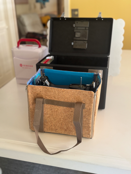 Protective zippered tote and workstation 2 in 1. Made of cork on the outside and cotton inside + mesh and fleece pockets to keep scissors, seam ripper, markers, etcetera. Protective sleeve cover turns into trash catcher on the side.